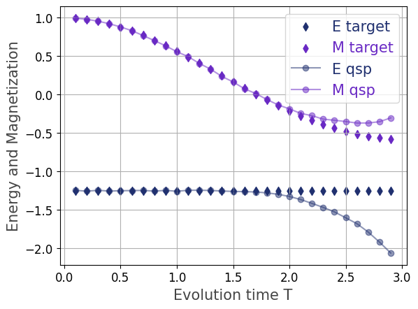 Divergence Phase \(T>2.0\): Beyond \(T=2.0\), the quantum simulation results diverge noticeably from the classical benchmark. Both \(M_{\text{qsp}}\) and \(E_{\text{qsp}}\) drift away from the classical trajectories, with the energy showing a significant downward trend.